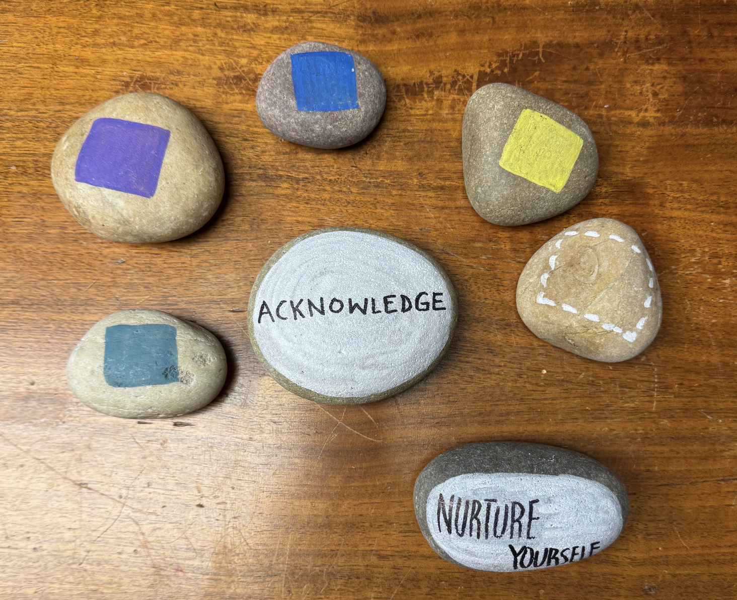 Stone is a grounded tangible object. Weight and texture of the stone offer somatic regulation and metaphorical enduring resilience.