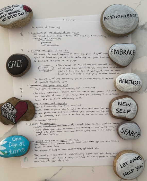 Prompt: “Choose colors that symbolize your feelings. You can use symbols, simple shapes, or write a word–whatever feelings right to you. Think about what ongoing bond you want to acknowledge? or perhaps what you need to be reminded of in hard moments? Your stone does not need to be pretty or perfect, it only needs to be meaningful.”