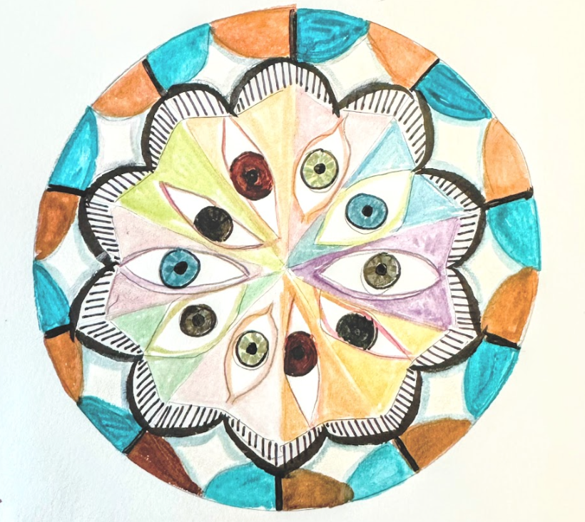 Prompt: “Create a circle—symbolizing wholeness, balance, and connection. This circle is the container for your inner landscape today. Inside your circle, begin creating patterns, colors, textures, or symbols. There is no right or wrong. Let your hand move slowly and mindfully.”