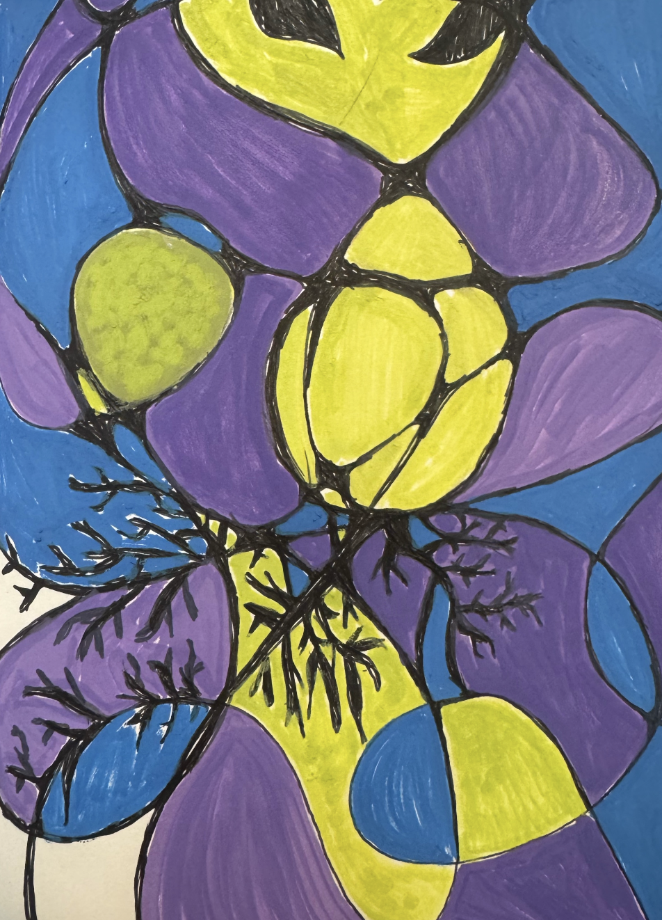 Prompt: “Fill the spaces between the lines with color. Choose colors intuitively—let yourself be drawn to what feels right. You may add a circle or other shape if you’d like—symbols of containment, unity, or expansion.